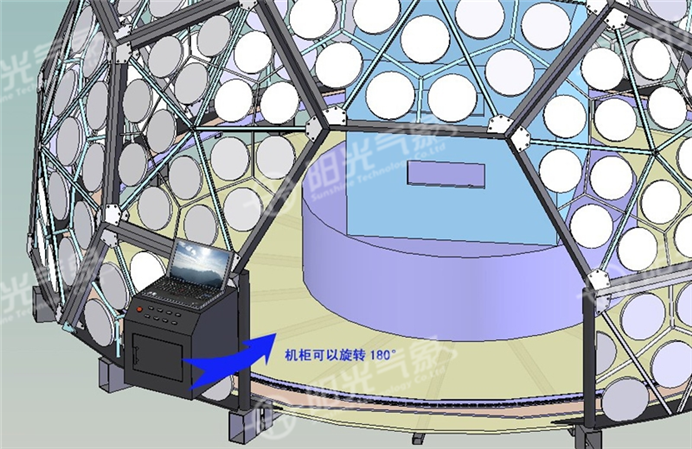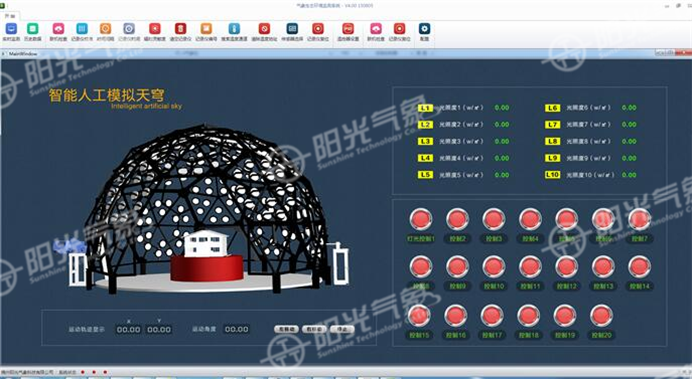 本系統(tǒng)是內(nèi)透光擴散形式,采用智能控制技術(shù),增加了太陽模擬燈,不僅可模擬標準的CIE全云天,而且可做日照模擬實驗。光源采用高亮度LED矩陣,節(jié)能而且壽命長免維護。