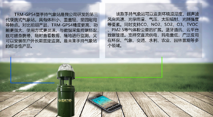 TRM-GPS4型手持氣象站是我公司研發(fā)的第三代手持式氣象儀器,具有體積小、重量輕、堅(jiān)固耐用等特點(diǎn)。對(duì)比常規(guī)手持產(chǎn)品,TRM-GPS4精度更高、功能更強(qiáng)大、使用方式更靈活。與數(shù)據(jù)采集終端搭配,即可隨身攜帶、隨時(shí)查看數(shù)據(jù)、隨地進(jìn)行監(jiān)測(cè),又可以安裝在戶外長(zhǎng)期固定監(jiān)測(cè)。是未來手持氣象站標(biāo)志性產(chǎn)品。