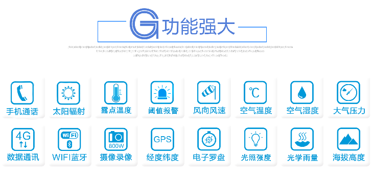 ●功能強(qiáng)大超越了目前所有的手持產(chǎn)品:測(cè)量要素為:風(fēng)速,風(fēng)向,氣壓,環(huán)境溫度,環(huán)境濕度,太陽(yáng)輻射,露點(diǎn),海拔高度,經(jīng)緯度,GPS衛(wèi)星定位,電子羅盤,,照拍/錄像 , 手機(jī)通話功能 , GPRS無線數(shù)據(jù)網(wǎng)絡(luò),還可以拓展CO、NO2、SO2、O3、TVOC、PM2.5、PM10等監(jiān)測(cè)要素。