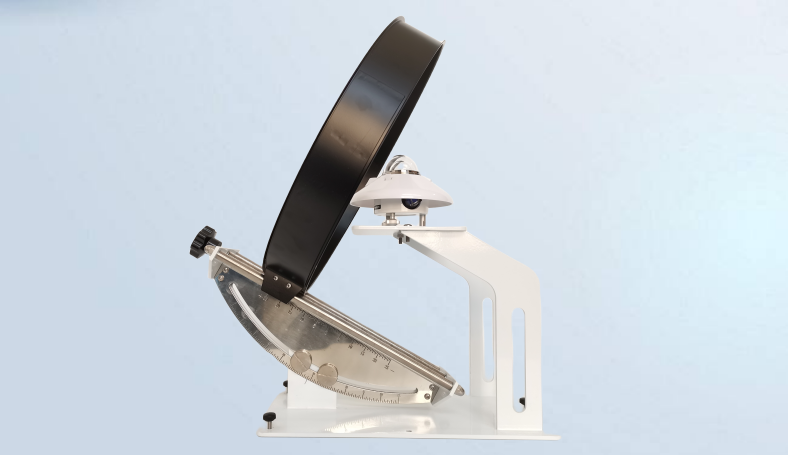 本裝置設(shè)有寬度為65mm,直徑為400mm的遮光環(huán)圈,固定在刻有緯度刻度與赤緯刻度標(biāo)尺的絲桿調(diào)整螺旋上。標(biāo)尺與支架固定在底盤上,根據(jù)架射地點(diǎn)的地理緯度而固定??傒椛浔戆惭b在支架平臺上,其高度應(yīng)正好使輻射感應(yīng)平面(黑體)位于遮光環(huán)中心。通過調(diào)節(jié)赤緯度,可使遮光環(huán)全天遮住太陽的直接輻射。