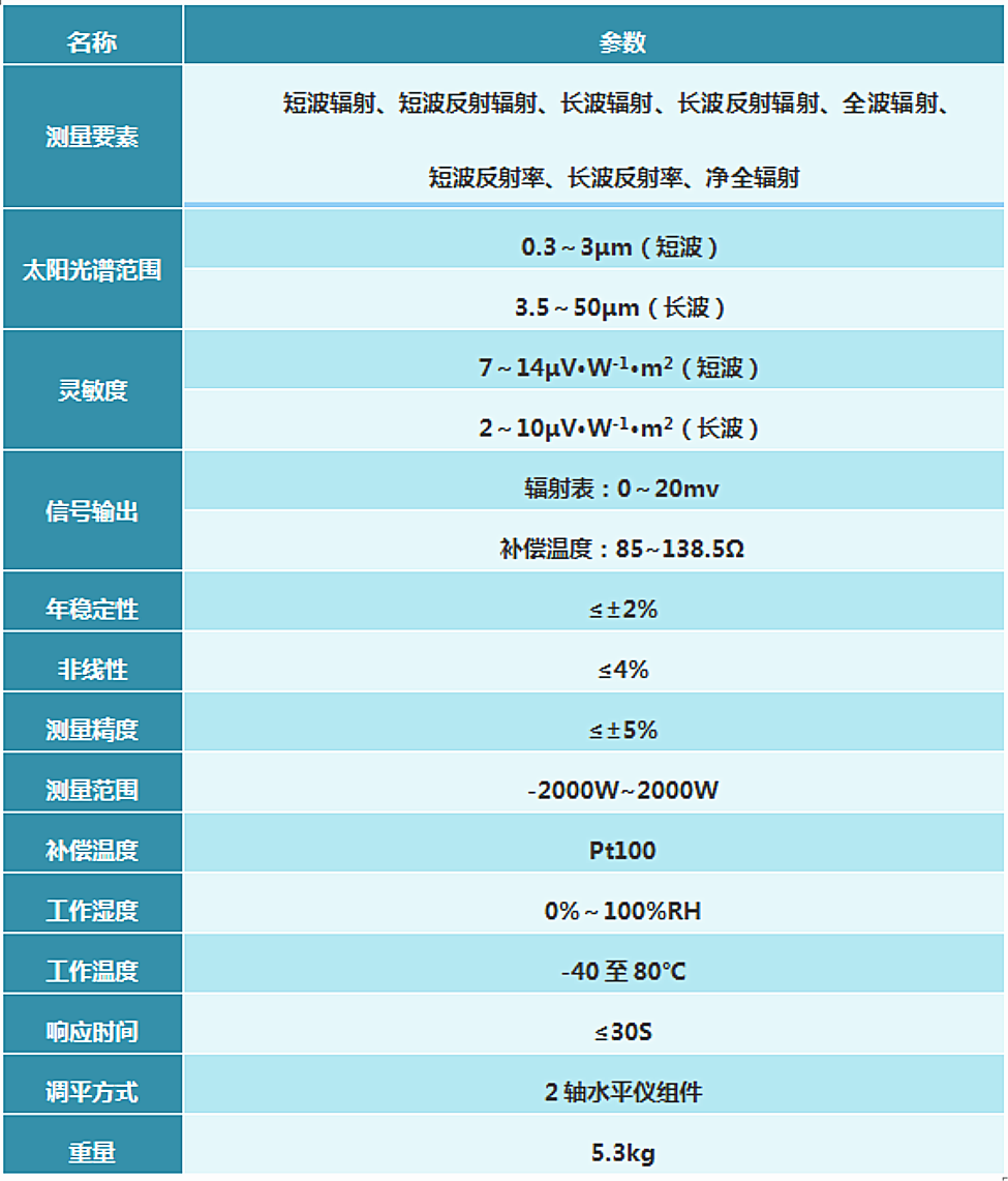 每只輻射表都分別有各自的靈敏度系數(shù)和輸出導線,可單獨輸出各個數(shù)據(jù),同時通過各自的輸出數(shù)據(jù)進行組合,分別能測量短波輻射、短波反射輻射、長波輻射、長波反射輻射、全波輻射、凈全輻射、短波反射率和長波反射率。